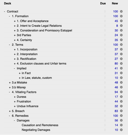 Just like physical flashcards, you arrange your anki flashcards into ‘decks’ of cards. You can see how I have arranged some of my decks when I was studying Contract Law in the picture below.