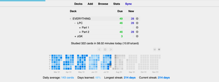 A favourite is the Review Heatmap add on (available here: https://github.com/glutanimate/review-heatmap/releases/tag/v0.7.0-beta.1. Note that most add-ons are available straight on the Anki website, but for some you have to go to websites like GitHub.) The Review Heatmap gives you a pretty coloured square for each day you review cards on, which incentivises you to keep your streak going. As you can see on the picture below, I’m currently on my longest ever streak for these decks.